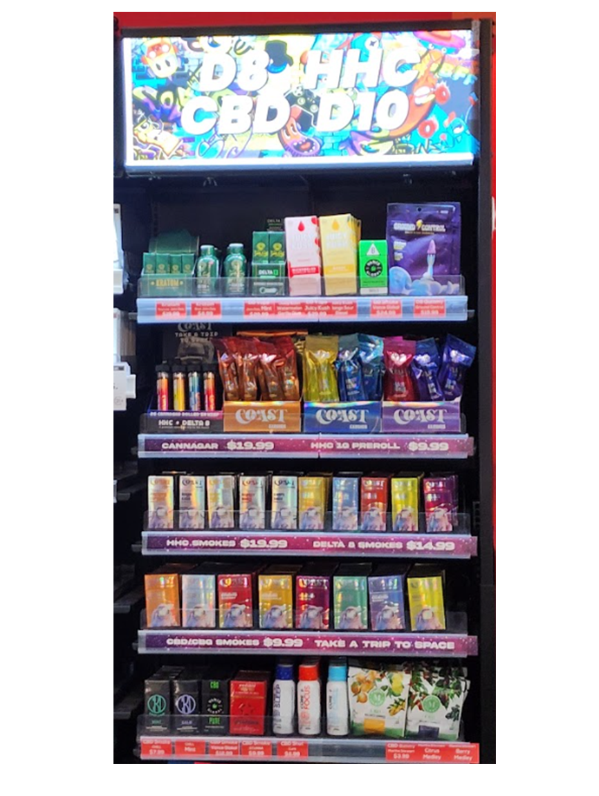 Behind the counter is our exclusive showcase for wraps, Delta-8, HHC, CBD, and Delta-10 items, strategically placed for optimal customer engagement.